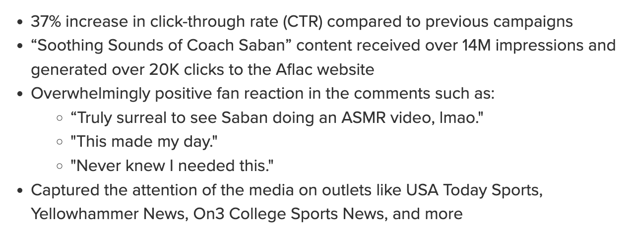 Coach Nick Saban is not exactly comfortable in front of the camera. We turned his awkwardness into a plus by having the coaching legend try his hand at ASMR, earning loads of earned media in the process. Even his daughter loved it.